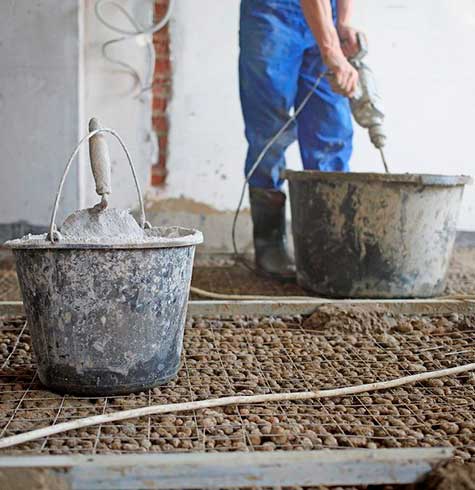 На следующем этапе по основанию распределяется необходимое количество цементно-песчаной смеси. Для ее выравнивания используется правило. Во избежание образования трещин нарезаются деформационные швы. После высыхания раствора специальной затирочной машиной проводится шлифовка поверхности.